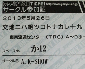 合体スペース配置のミスを受け、主催のスタジオyouに問合わせた結果、納得のいくご返答をいただけなかったことと、搬入物で周りのサークル様にご迷惑がかかってしまう恐れがあるため、今回の交地19は参加をキャンセルさせていただくこととなりました。